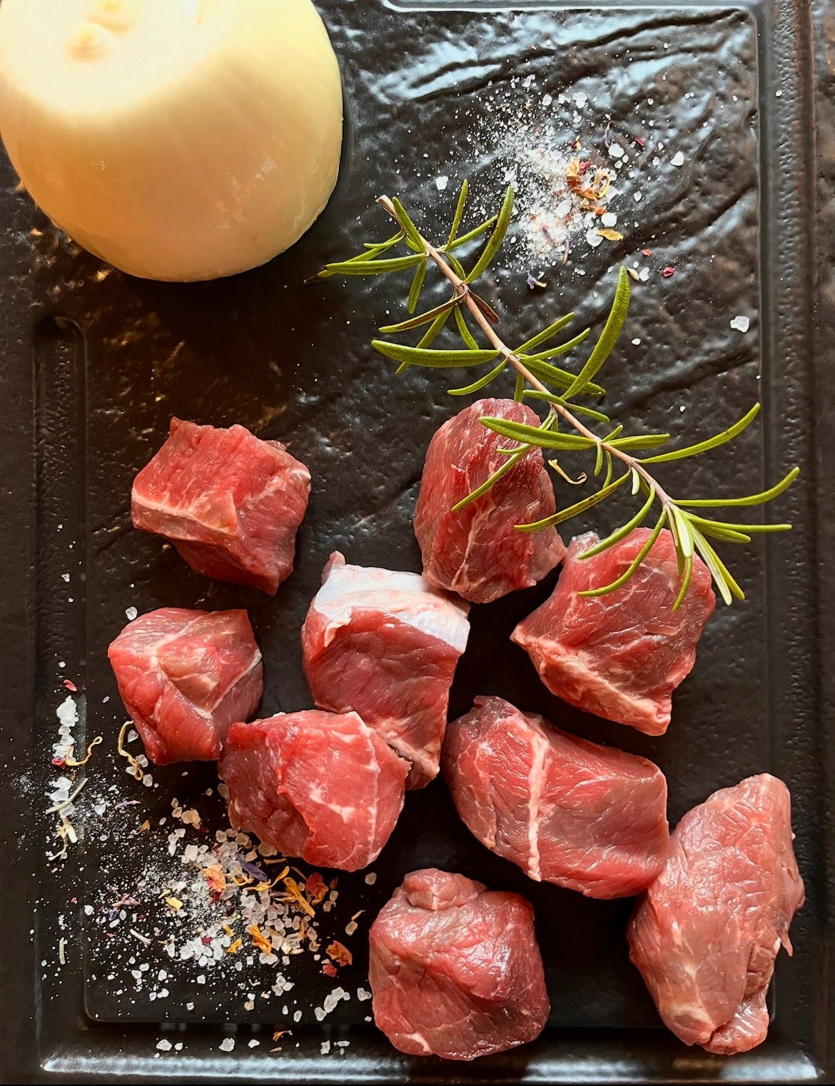 Cubetti ricavati dai tagli più saporiti dell’anteriore. In cottura diventa morbidissimo.