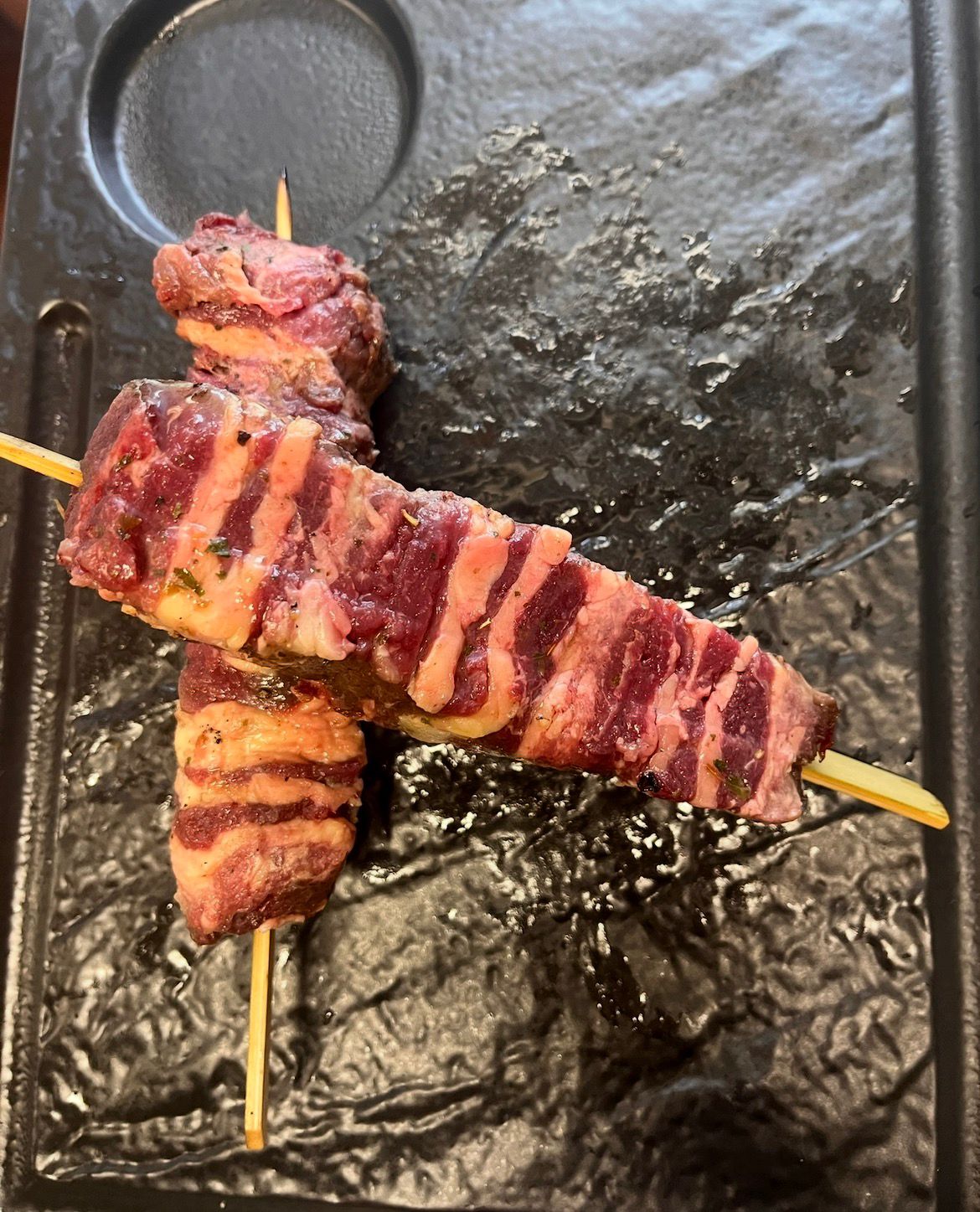 Bocconcini selezionati e alternati a verdure o pancetta, pronti per la griglia o la piastra.